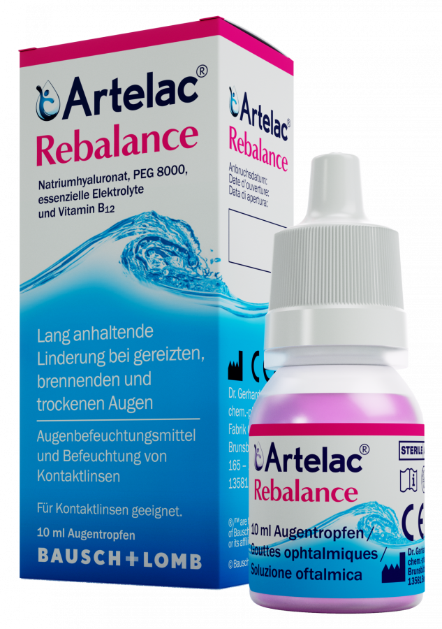Artelac Rebalance satur nātrija hialuronātu, mitrinātāju un polimēru PEG 8000, kas pagarina iedarbības laiku un stabilizē asaru plēvi. Šī kombinācija nodrošina ilgstošu atvieglojumu, neradot neskaidru redzi.