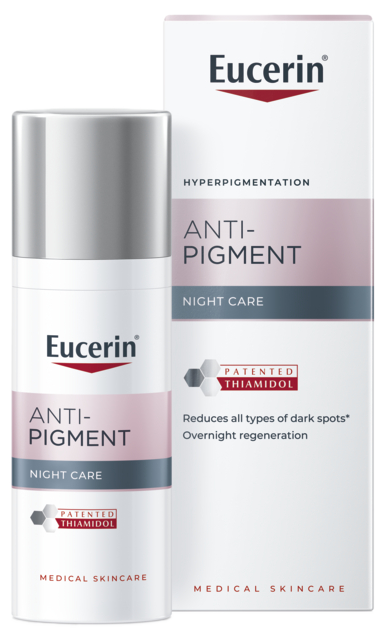 Eucerin Anti-Pigment nakts krēms satur tiamidolu – efektīvu un patentētu sastāvdaļu, kas iedarbojas uz hiperpigmentācijas pamatcēloni, samazinot melanīna ražošanu. Klīniski un dermatoloģiski ir pierādīts, ka tas samazina tumšos plankumus un novērš to atkārtotu parādīšanos. Pirmie rezultāti ir redzami pēc divām nedēļām, un, regulāri lietojot, var nodrošināt pastāvīgus uzlabojumus.