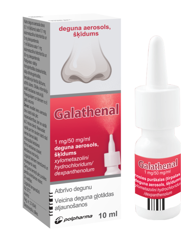 Galathenal ir deguna aerosols. Galathenal satur aktīvo vielu ksilometazolīna hidrohlorīdu, kas sašaurina asinsvadus un tādējādi mazina deguna gļotādas pietūkumu.