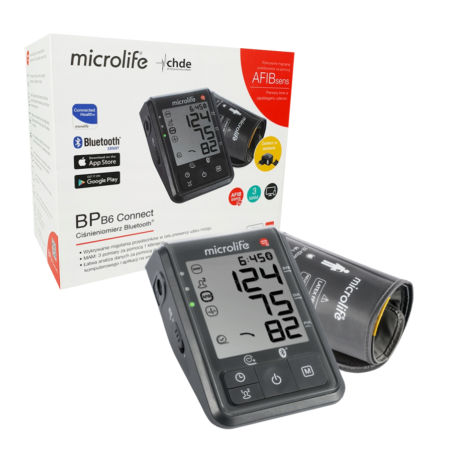 MICROLIFE BP B6 Connect ir ierīce arteriālā spiediena mērīšanai mājas apstākļos, kas nosaka mirdzaritmiju. Jaunākā Sens Afib tehnoloģija ļauj noteikt mirdzaritmiju gan vienkārtējos, gan trīskārtējos mērījumos. Tā ir tehniski ideāla ierīce, bet ļoti vienkārša izmantošana. Viņš precīzi mēra arteriālo spiedienu pat “grūtiem” pacientiem ar aritmiju, grūtniecēm ar preteklampiju un diabētiķiem.