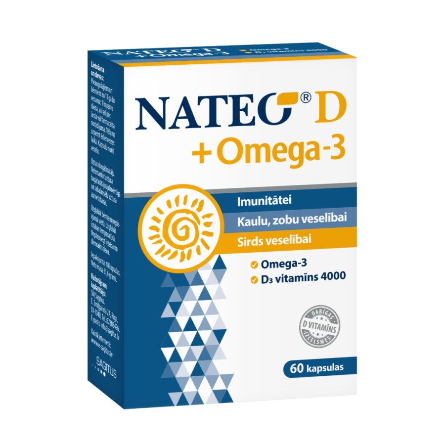 Dabīgas izcelsmes D vitamīns (zīme). Kapsulas ar D3 vitamīnu un augstas koncentrācijas Omega-3. D vitamīns veicina normālu imūnsistēmas darbību, palīdz uzturēt zobu un kaulu veselību, kā arī normālu muskuļu darbību. Omega-3 taukskābes EPS un DHS veicina normālu sirds darbību. Labvēlīgu ietekmi panāk ik dienas uzņemot vismaz 250 mg EPS un DHS.