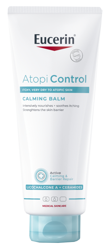 Атопичная кожа — это раздражительная, сухая и склонная к зуду кожа. Зуд провоцирует расчесывание, что мешает хорошему ночному сну и может отрицательно влиять на качество жизни. Успокаивающий бальзам Eucerin AtopiControl Calming Balm предназначен для ежедневного ухода за телом, и его особая формула успокаивает и интенсивно увлажняет раздраженную и зудящую кожу. Этот легкий, но питательный водно-масляный бальзам обогащен успокаивающим ликохалконом А, церамидами и маслом ши для укрепления защитного барьера кожи и уменьшения сухости и зуда. Его также следует использовать во время обострений вместе с кремом Eucerin AtopiControl Acute Care Cream, спреем Eucerin Anti-Itch Spray и вашими обычными медицинсими препаратами. Бальзам от атопической экземы обеспечивает мгновенное увлажнение, чтобы кожа была мягкой и гладкой. При регулярном применении состояние кожи заметно улучшается. Этот не содержащий ароматизаторов бальзам имеет легкую, приятную, нежирную и нелипкую текстуру и быстро впитывается. Бальзам Eucerin AtopiControl Calming Balm дерматологически проверен для сухой атопической кожи. Он безопасен для нежной кожи новорожденных и детей, а также для зоны подгузников с возраста 1 месяц. Благодаря нежной, но эффективной формуле он идеально подходит для детей и взрослых, а, значит, для всей семьи, и сохраняет защитный барьер и активно успокаивает зудящую кожу.
