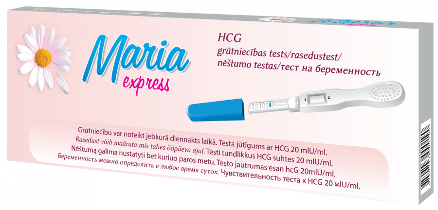 Тест Maria Express может определить беременность на ранней стадии- за 2 дня до начала вашего ожидаемого менструального цикла. Для проведения теста на беременность подходит образец мочи, взятый в любое время суток,но образец первой утренней мочи является оптимальным из-за самой высокой концентрации HCG. Тесты Maria Express удобны при использовании. Надо просто подставить узкий конец теста под струю мочи.