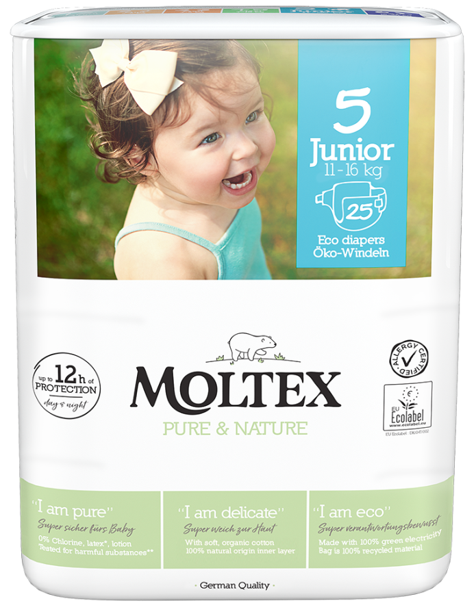 Подгузники “Moltex Pure & Nature” 5 JUNIOR предназначены для детей весом 11-25 кг.
